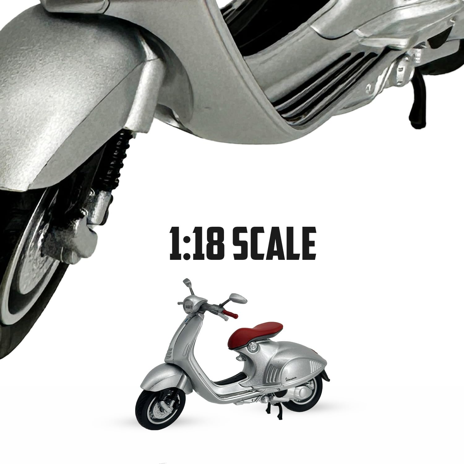 DIECAST SCOOTER: Complete or add to your diecast collection with the 1:18 Scale Model Replica Vespa 946 (2014). This model scooter features true-to-scale detail with rotating rubber tires, working kick stand, adjustable handle bars, and adjustable front wheel.